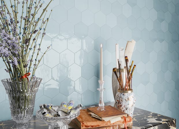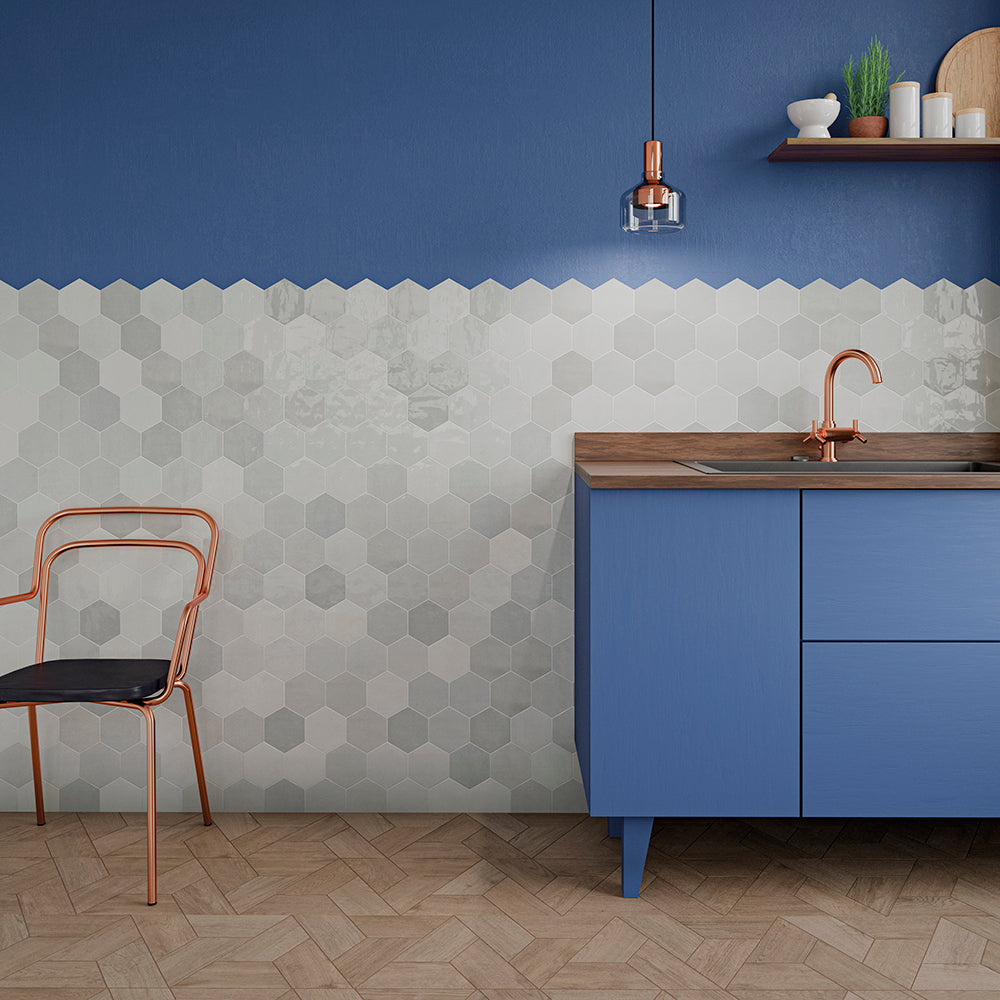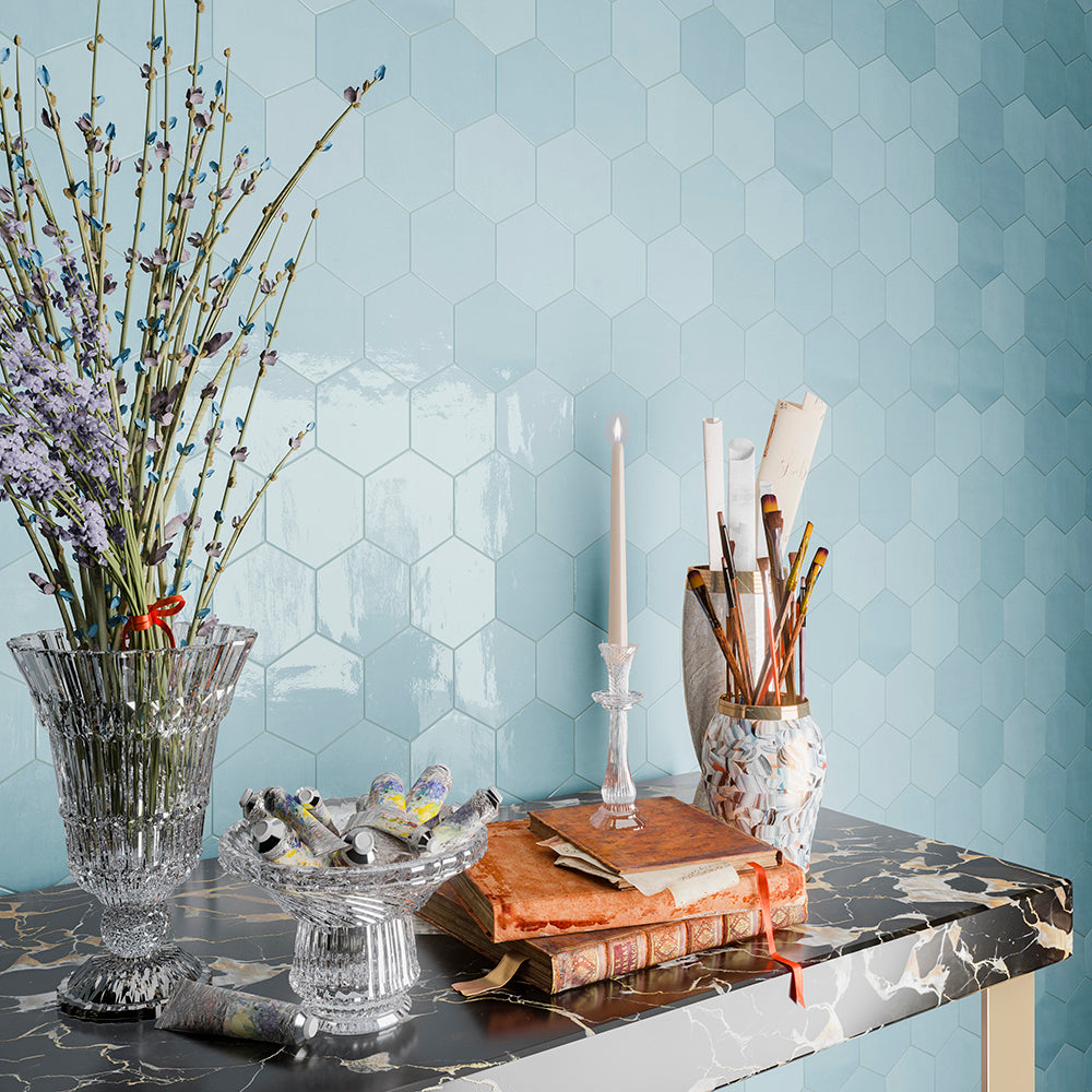 Shadow Hex | 4"x5" Hexagon | 4"x5" Hexagon | 8.5mm | Aqua | Glossy | Wall | Ceramic | Stock Item | WOWAQGLSHADOHE45 |